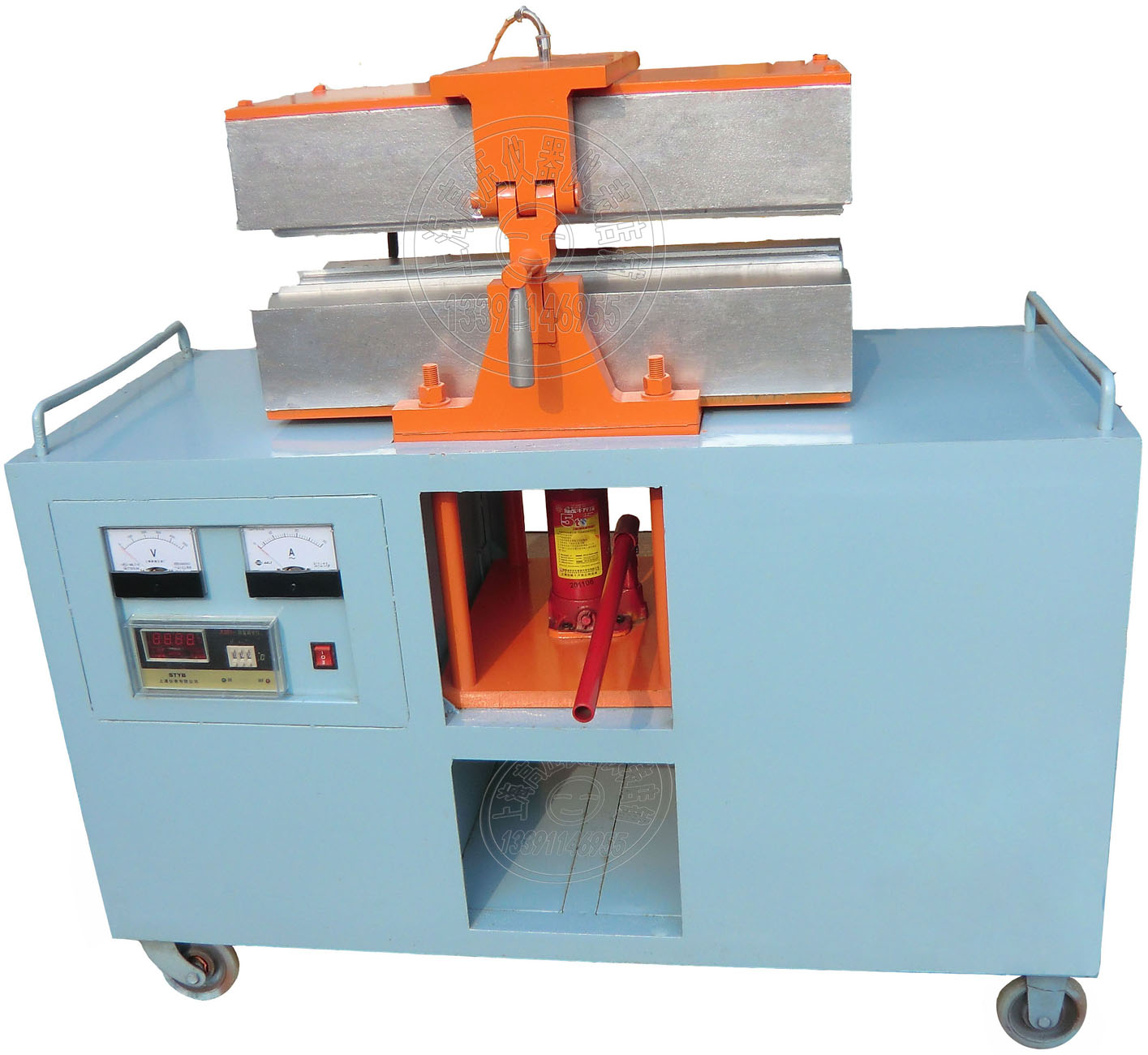 热补机主要有支架、电气系统、液压系统、仪表控制板组成。液压系统主要有液压缸、活塞、阀和压杆组成,完成模具升降加压,保证加热粘补过程所需的压力;支架是热补机的主体构件,由型钢焊接组成,并设有行走机构、工具箱和配重铁,形成完整的统一机台,在工作中移动方便,电气加热系统分别组装,统一控制,设有定温、定时、灯光、电铃报警装置,形成良好的调整控制性能。